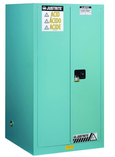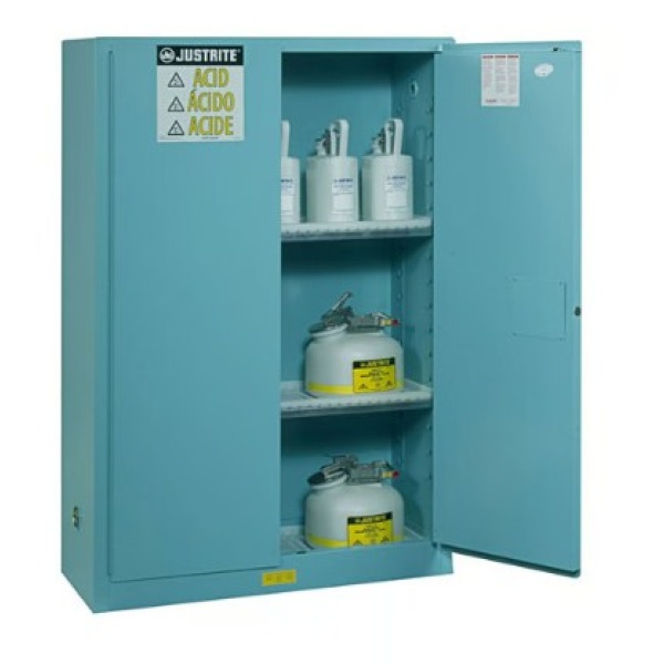 Justrite blue steel safety cabinets for corrosives have the same quality safety features as the cabinets for flammables. All models come with double-wall construction, dual vents, grounding wire connections, adjustable shelves, leakproof sills, three-point self-latching doors and leveling feet. Manual-close door(s) opens to a full 180 degrees and self-latches when pushed closed.